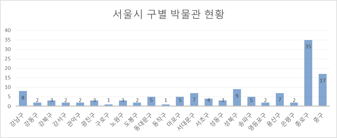 구별로 박물관과 미술관의 수를 헤아려 그래프를 만들어 보았습니다. 가장 박물관이 많은 구는 역시 압도적으로 종로구이고 다음으로 많은 구는 중구와 강남구입니다. 박물관이 가장 적은 구는 구로구와 동작구입니다.