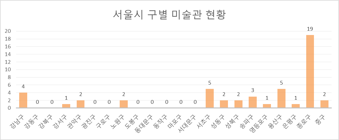 미술관의 경우도 압도적으로 종로구에 많고, 다음으로 많은 구는 서초구와 강남구입니다.